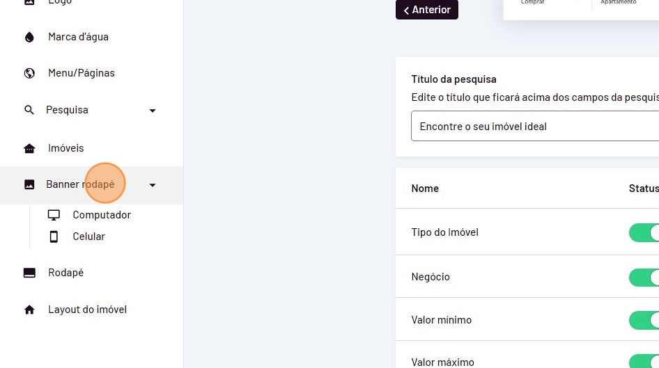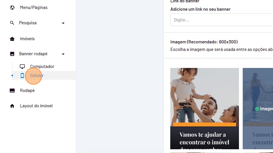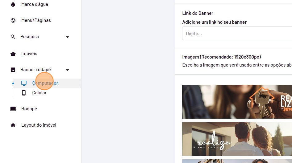 - Clique em "Banner rodapé" e selecione a opção "Computador" ou "Celular" para realizar as alterações.