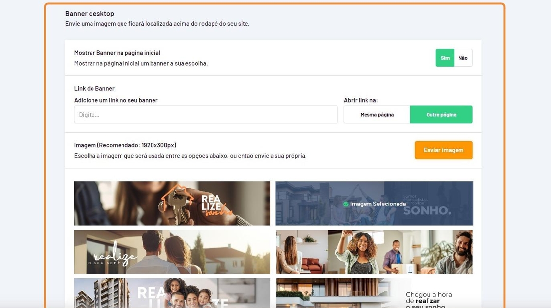 - Defina se vai mostrar o banner na página inicial, se vai adicionar um link no banner e a imagem que deseja utilizar (você poderá escolher uma de nossas imagens ou enviar do seu computador).
