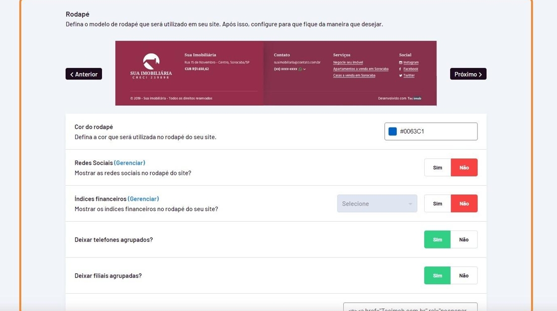 - Define o modelo de rodapé, a cor e as informações que irão ser adicionadas no rodapé do seu site.