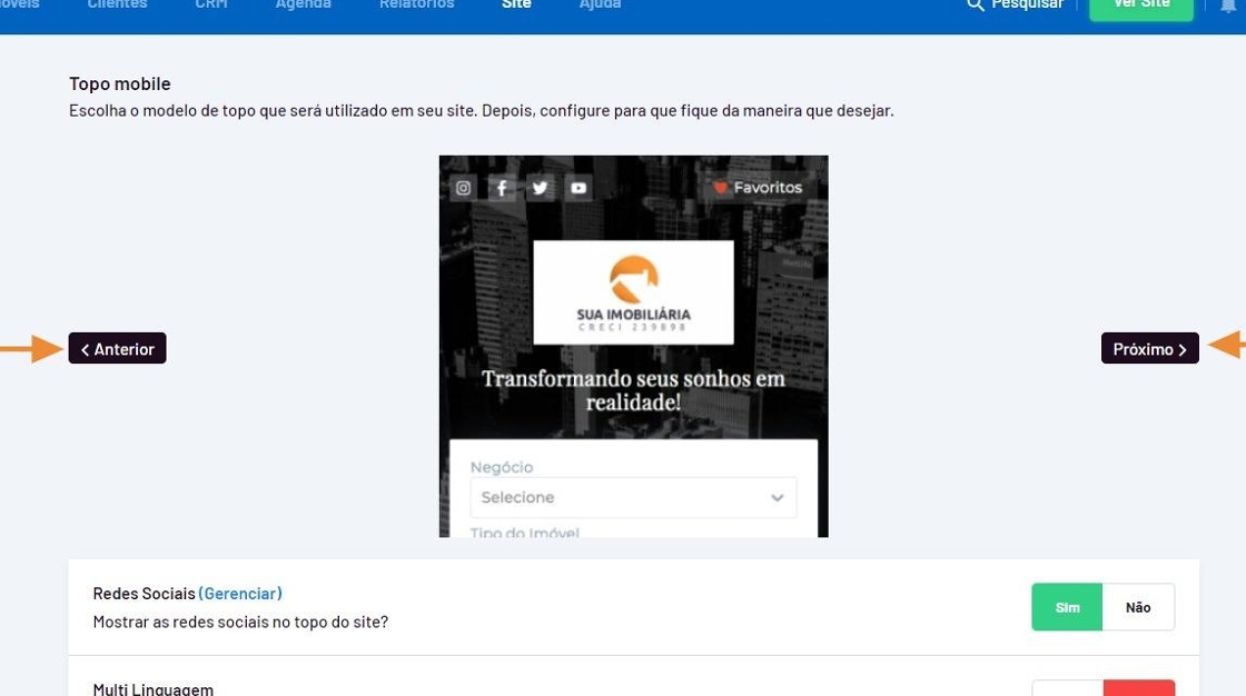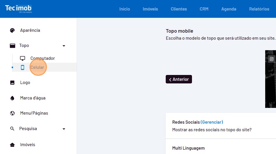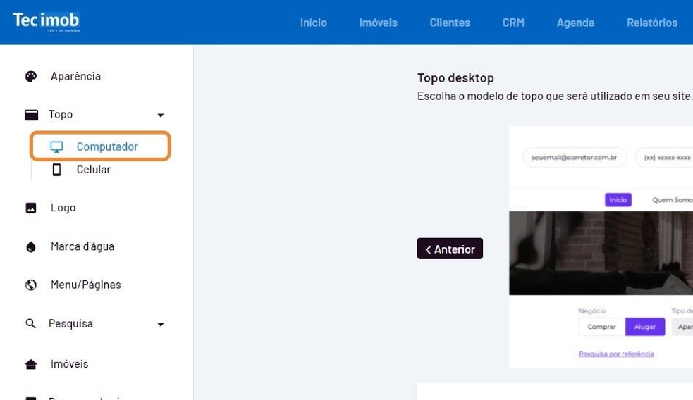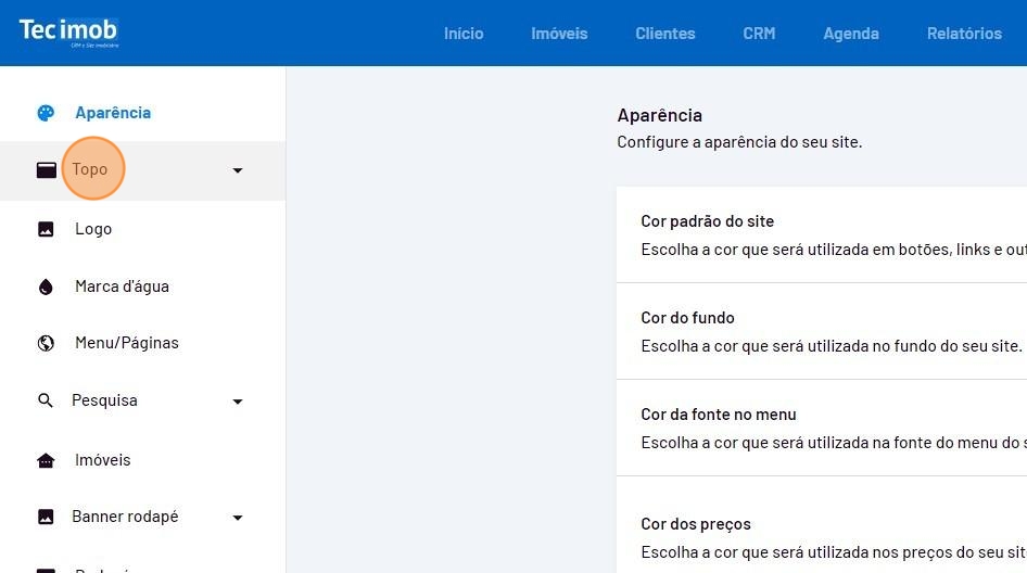 Para definir o topo do seu site no sistema Tecimob, siga estes passos: