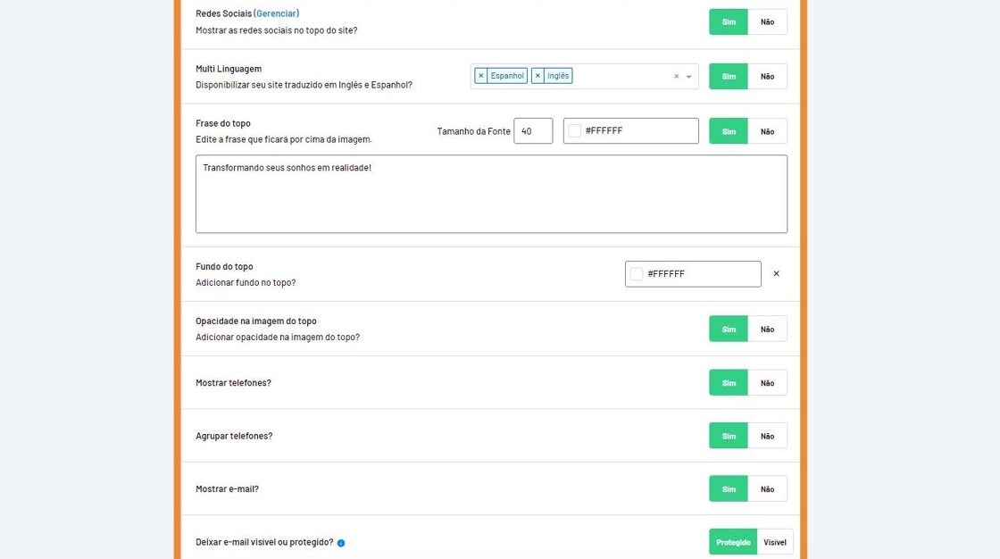 - Defina quais informações irão aparecer no topo, como redes sociais, multi linguagem, frase, a cor de fundo, se vai aplicar a opacidade na imagem de topo e dados de contato.