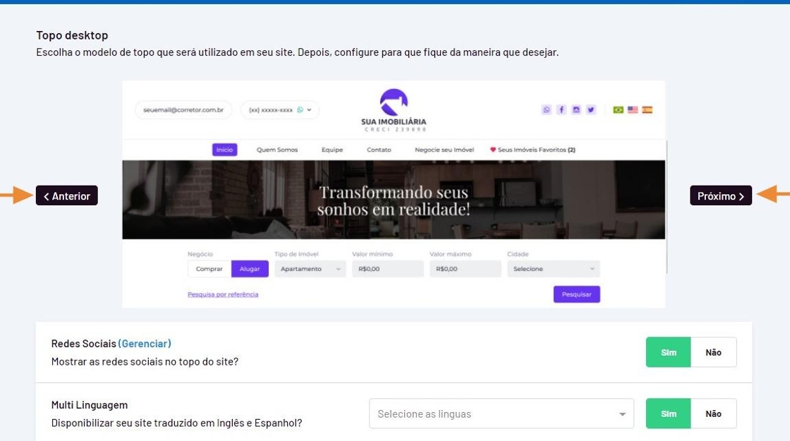 - Defina o layout do topo do seu site na versão do site para computador, clicando em "Anterior" e "Próximo".