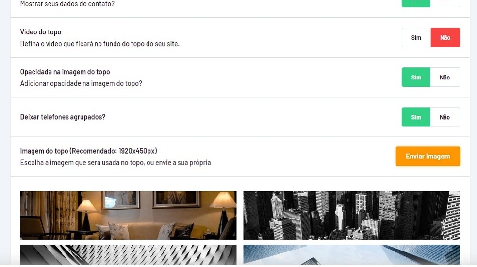 - Nas opções, você pode optar por uma imagem ou por um vídeo no topo do seu site.