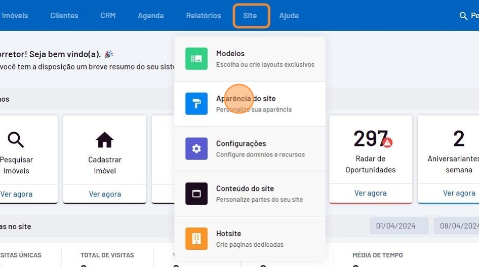 - Vá até o menu "Site" e clique em "Aparência do site".