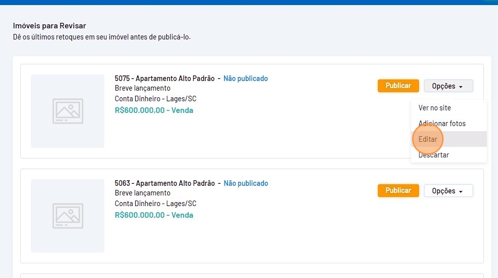 O link abaixo direcionará você diretamente para a área de imóveis "Rascunhos":