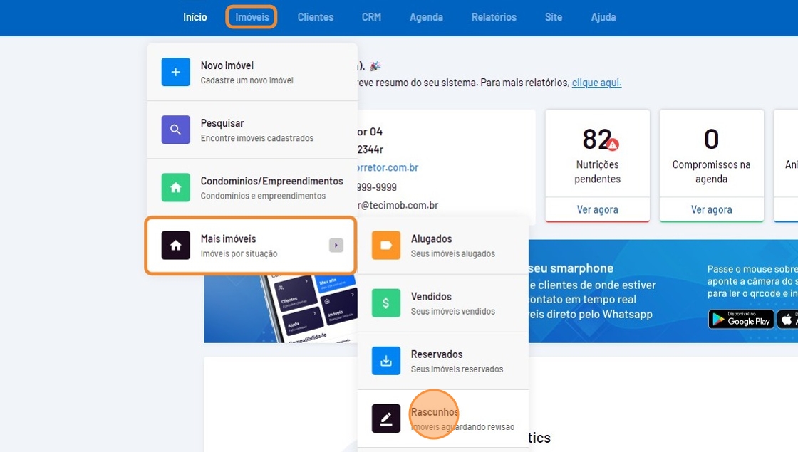 - Para publicar o imóvel no site, acesse o sistema e passe o mouse sobre o menu “Imóveis”. Passe o mouse em “Mais imóveis” e clique em “Rascunhos”.