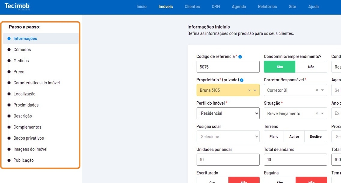 - Utilize o menu de navegação do canto esquerdo do sistema para revisar todas as informações do imóvel.