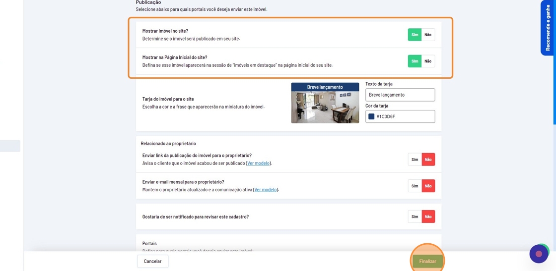 - Na última etapa (Publicação), você poderá definir se deseja mostrar este imóvel em seu site, selecionando também se ele aparecerá na página inicial.