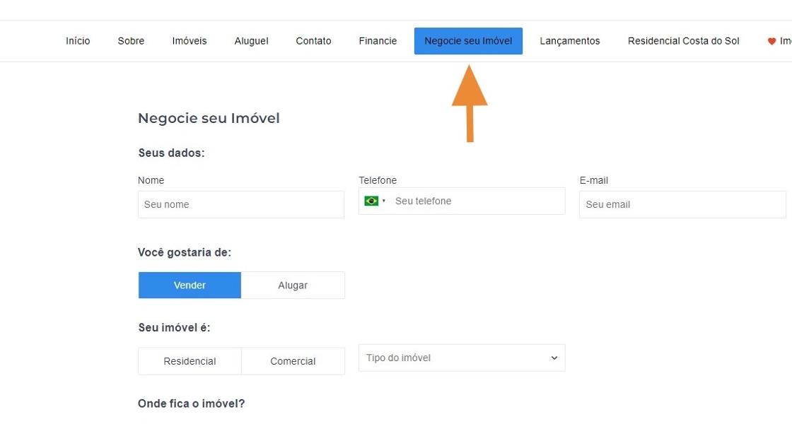 - Em seu site, o seu cliente terá acesso ao menu “Negocie seu imóvel" e poderá enviar as informações do imóvel que ele deseja colocar a venda ou para alugar.