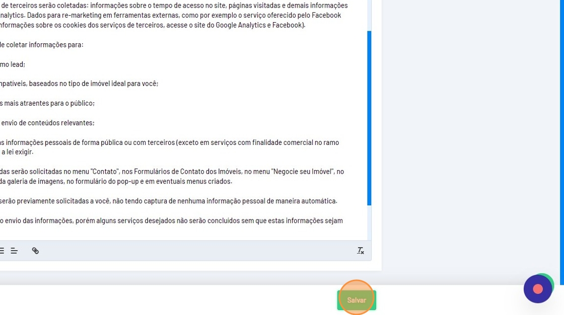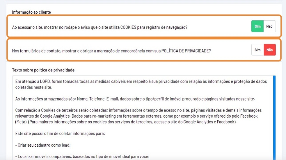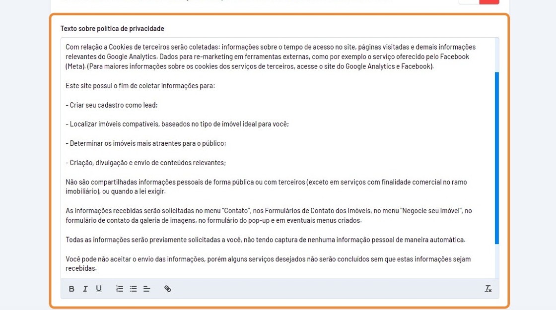 - Abaixo, você poderá também editar e complementar o texto sobre a Política de Privacidade.