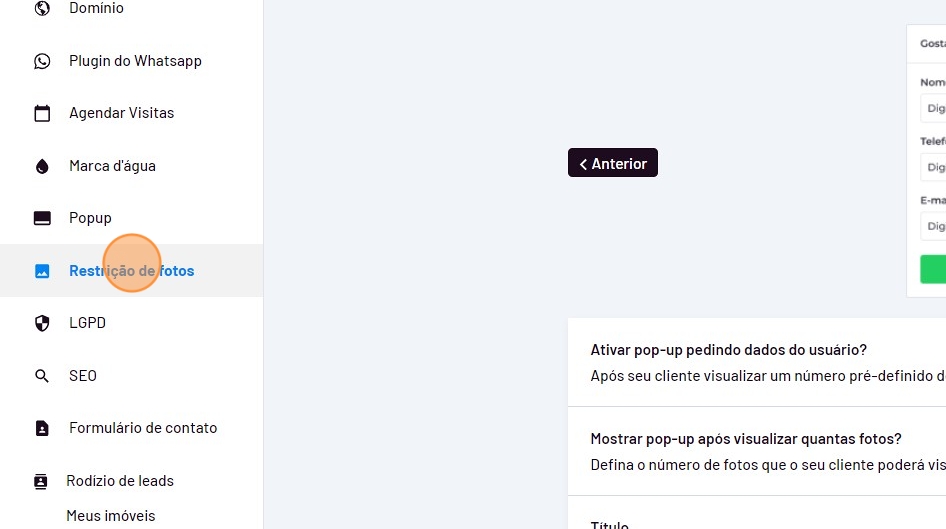 Para adicionar um pop-up de formulário de contato bloqueando a quantidade de fotos que seus clientes podem ver de cada imóvel, siga os passos abaixo: