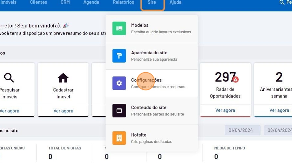 - Vá até o menu "Site" e clique em "Configurações".