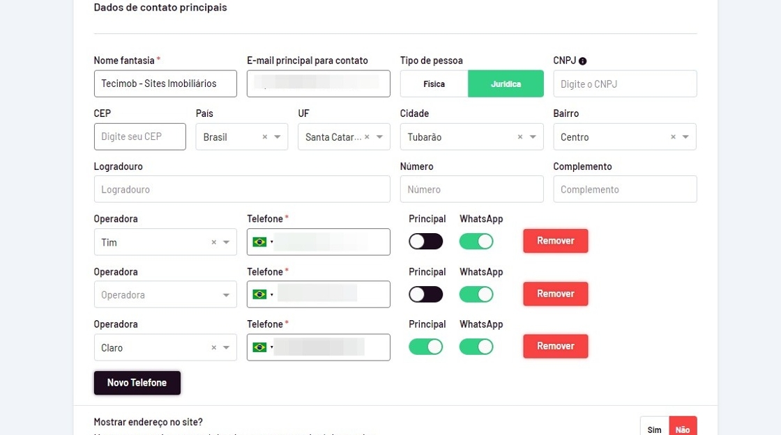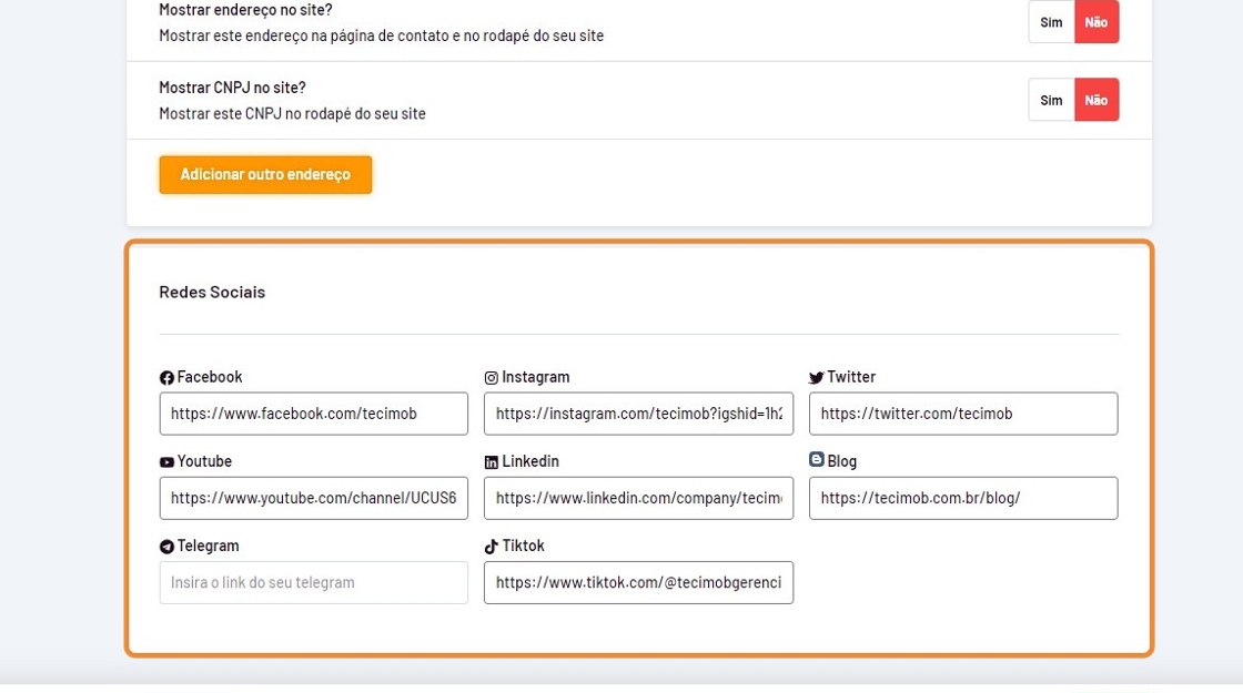 - Defina se você deseja mostrar o endereço e o cnpj/cpf em seu site.