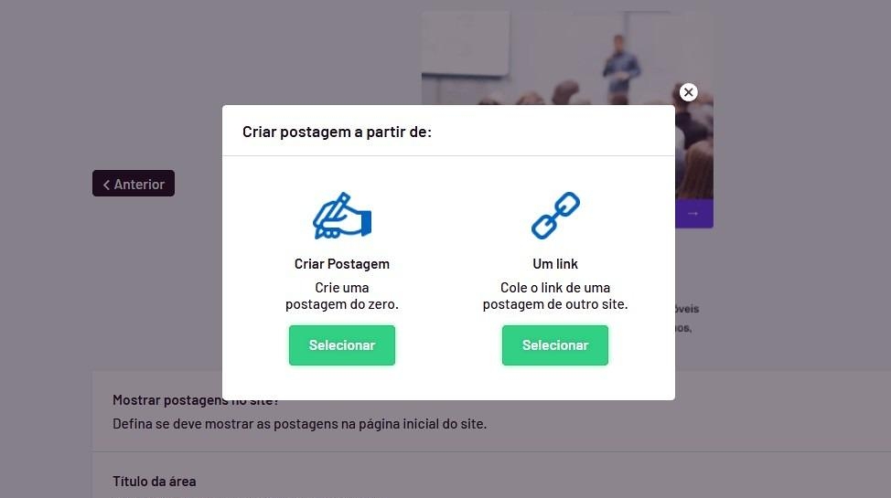 - Defina se irá "Criar uma postagem" do zero, ou criar uma postagem através de "Um link".