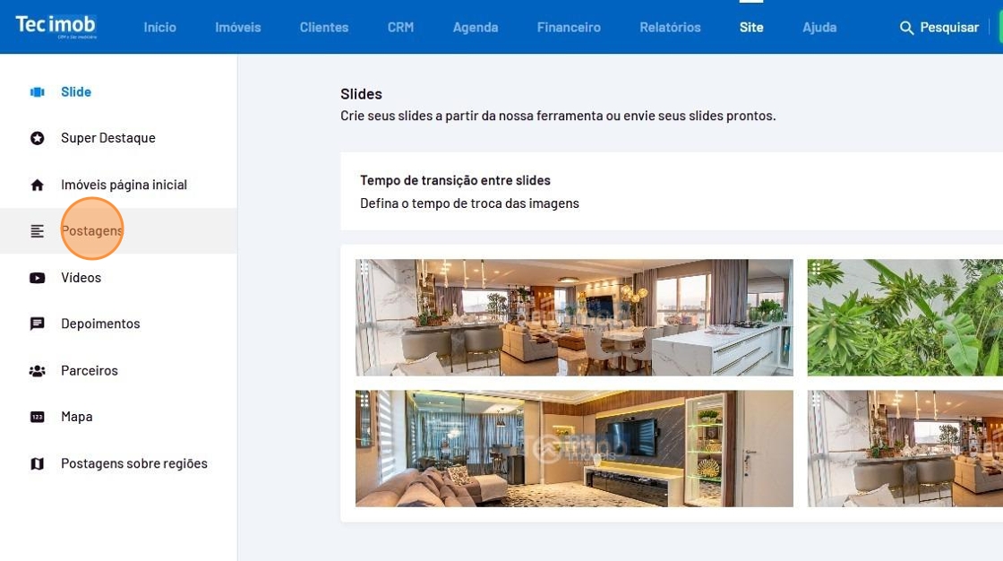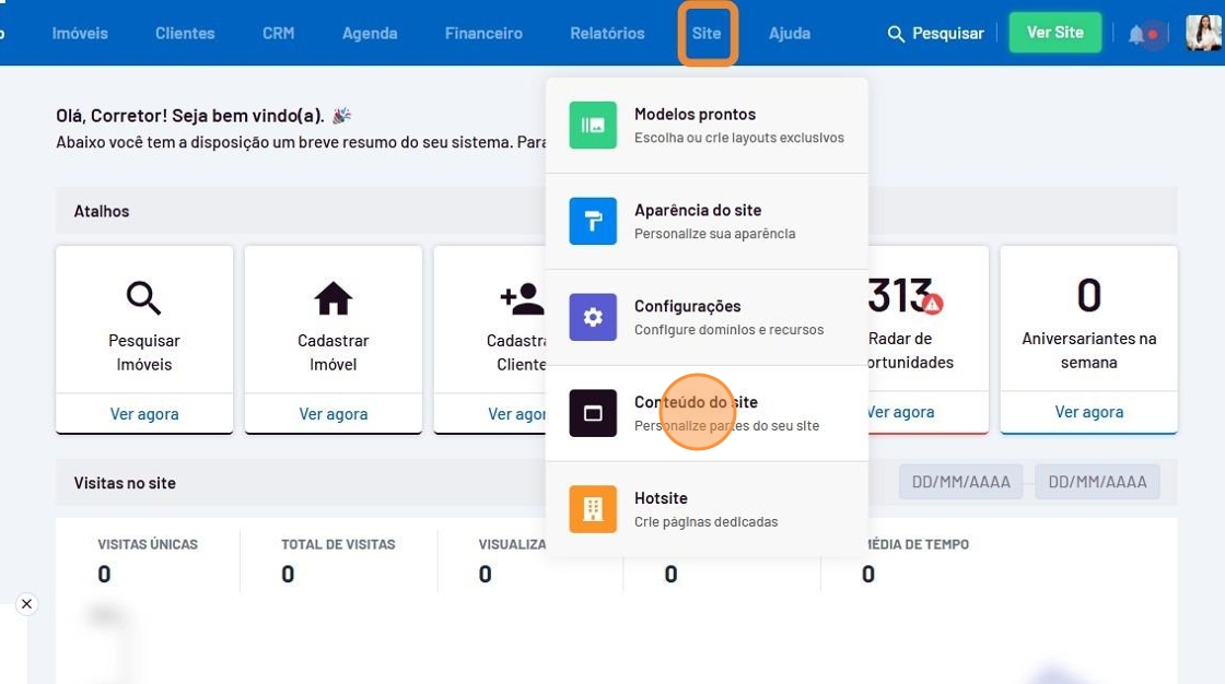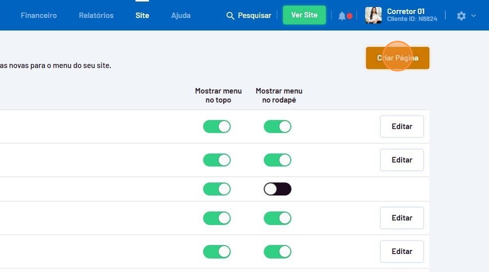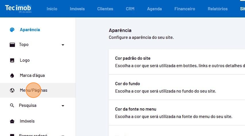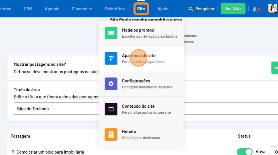 - Retorne ao sistema e vá ao menu Site e clique em "Aparência do site".