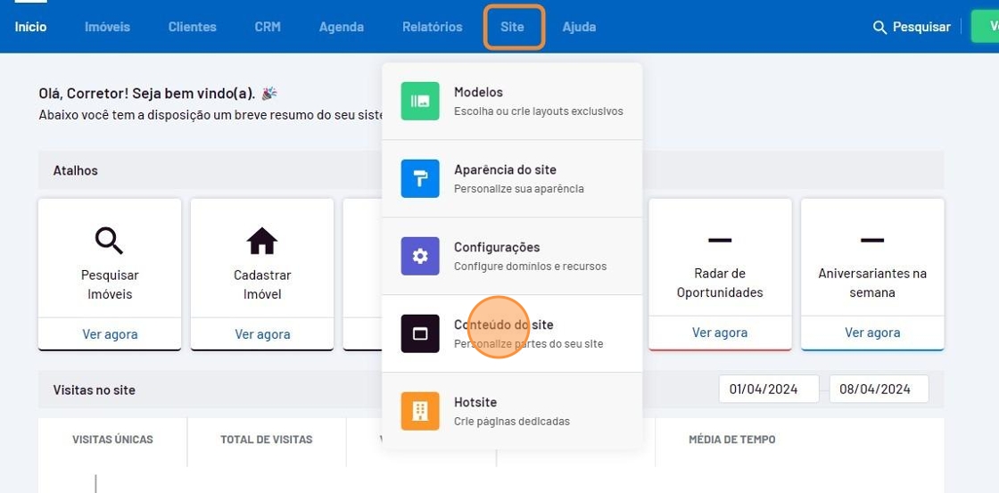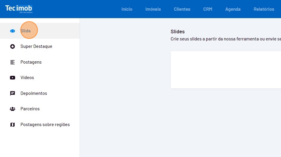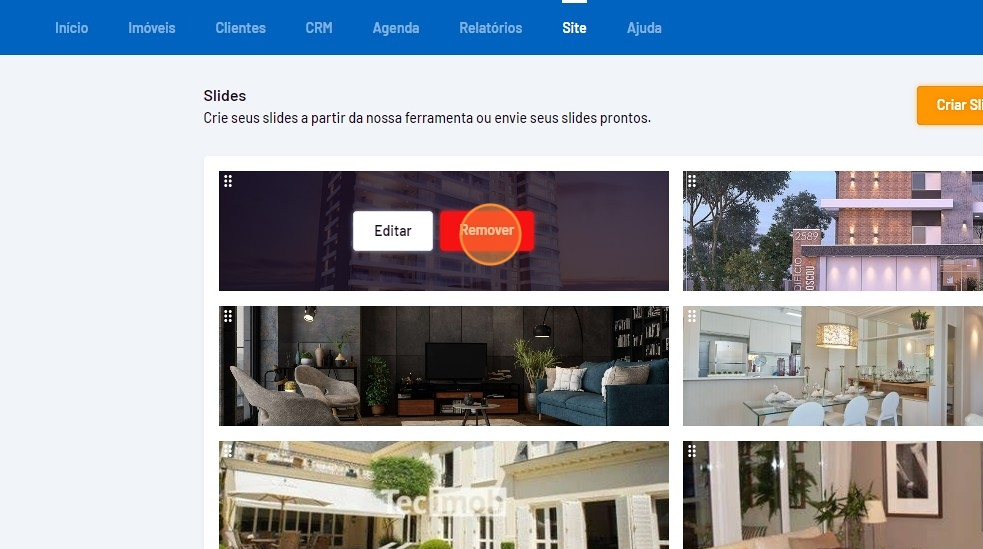 Para excluir um slide do site, siga estes passos: Vá até o menu Site" e clique em "Conteúdo do site". Clique em "Slide". Escolha o slide que deseja, passe o mouse sobre ele e clique em "Remover".