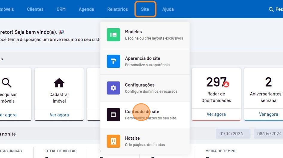- Vá até o menu "Site" e clique em "Conteúdo do site".