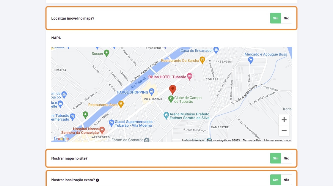 Nos imóveis cadastrados, as opções abaixo devem estar marcadas como "Sim" para que apareçam no mapa da página inicial: