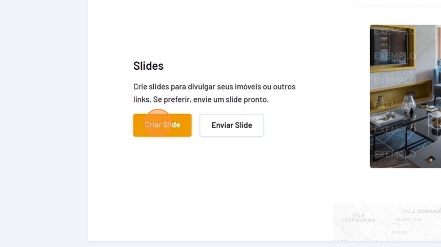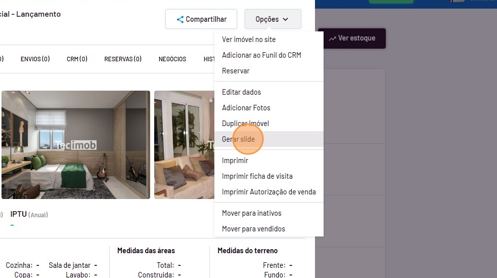 - Após encontrar o imóvel, clique sobre a imagem dele e passe o mouse em "Opções". Clique então em "Gerar slide".