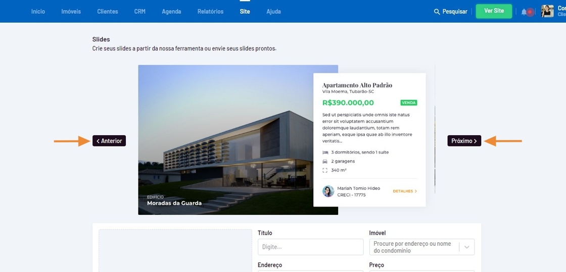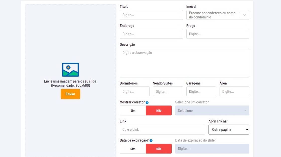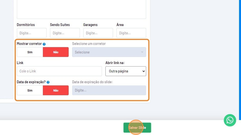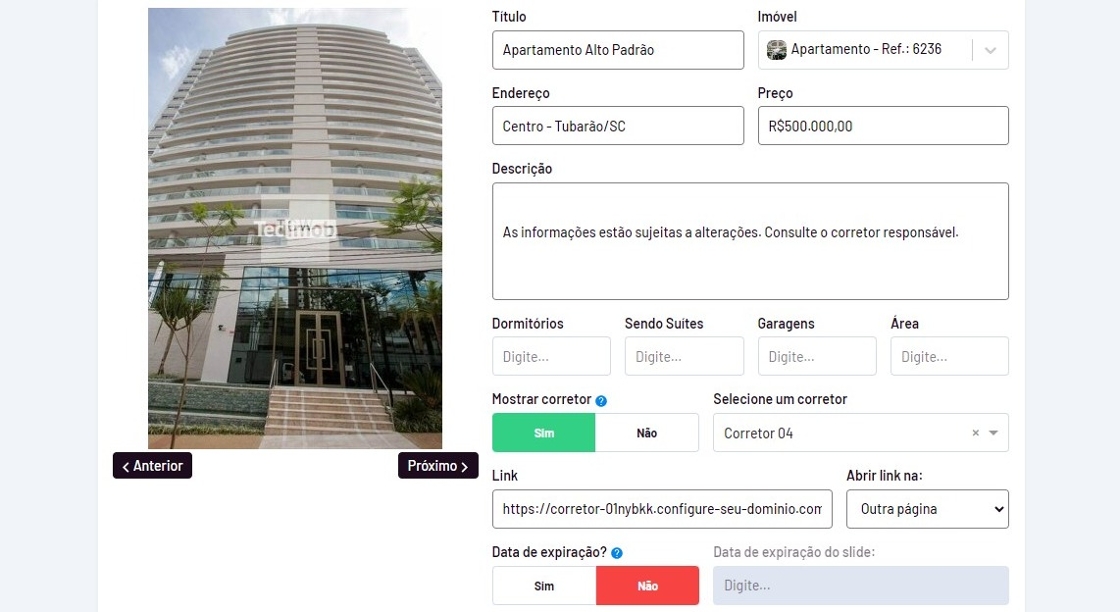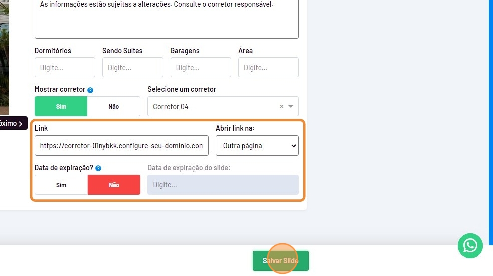- Você pode também definir de deseja mostrar os dados do corretor (e qual o corretor), selecionar se deseja abrir o link na mesma página ou em outra aba do navegador e por último definir uma data de expiração para que o Slide seja automaticamente desativado do seu site.