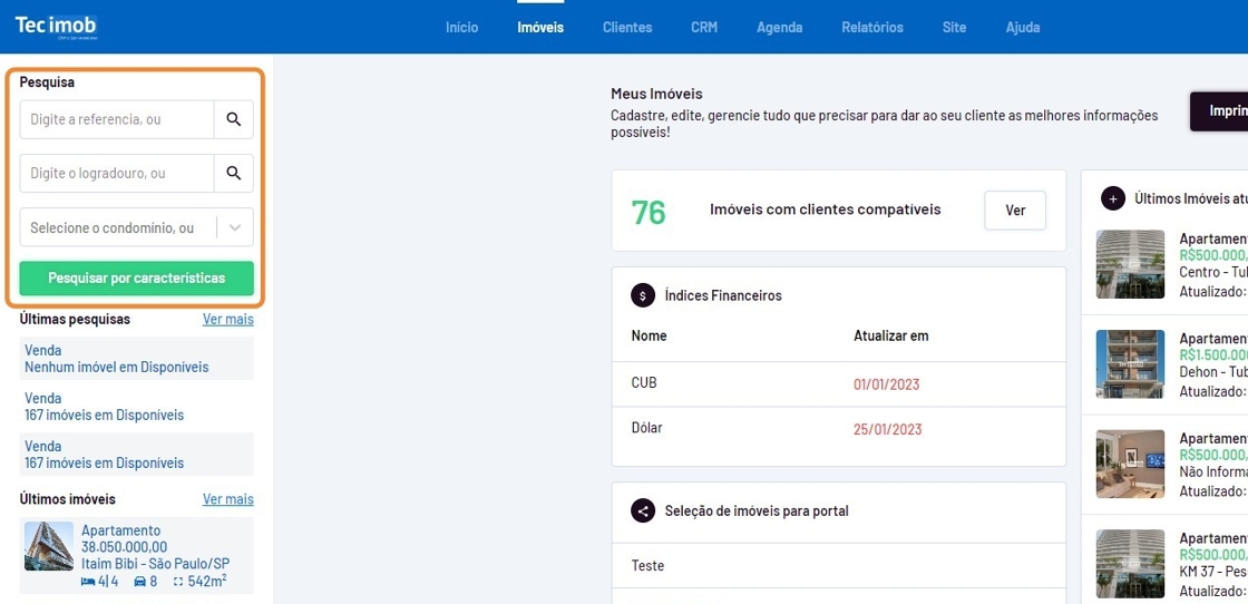 - Utilize o menu do canto esquerdo da tela para pesquisar pelo imóvel desejado.