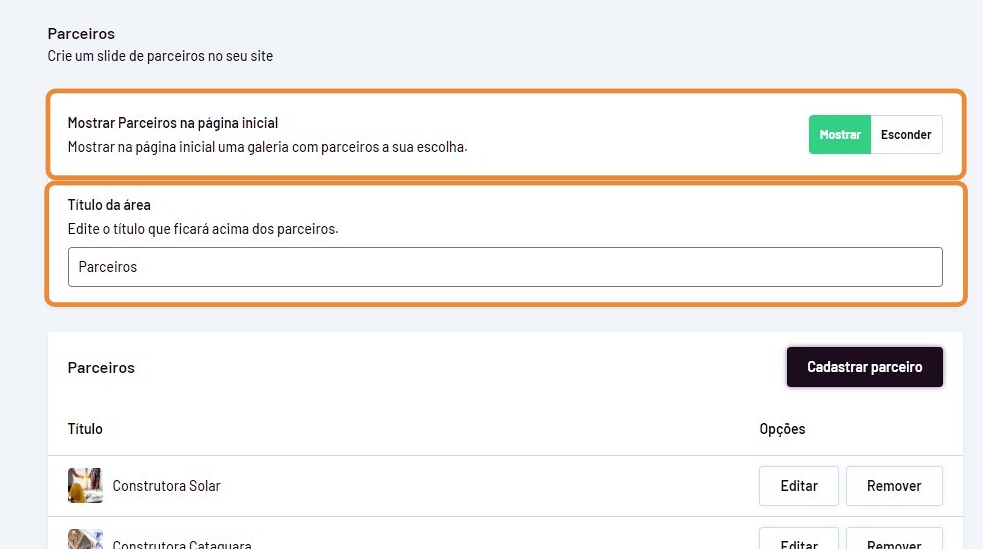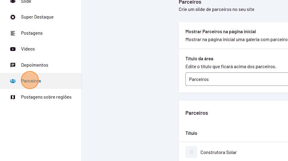 - Defina se irá mostrar a área "Parceiros" na página inicial e defina o título da área.