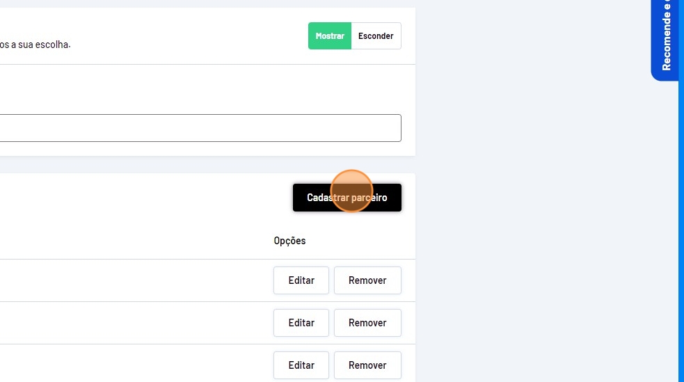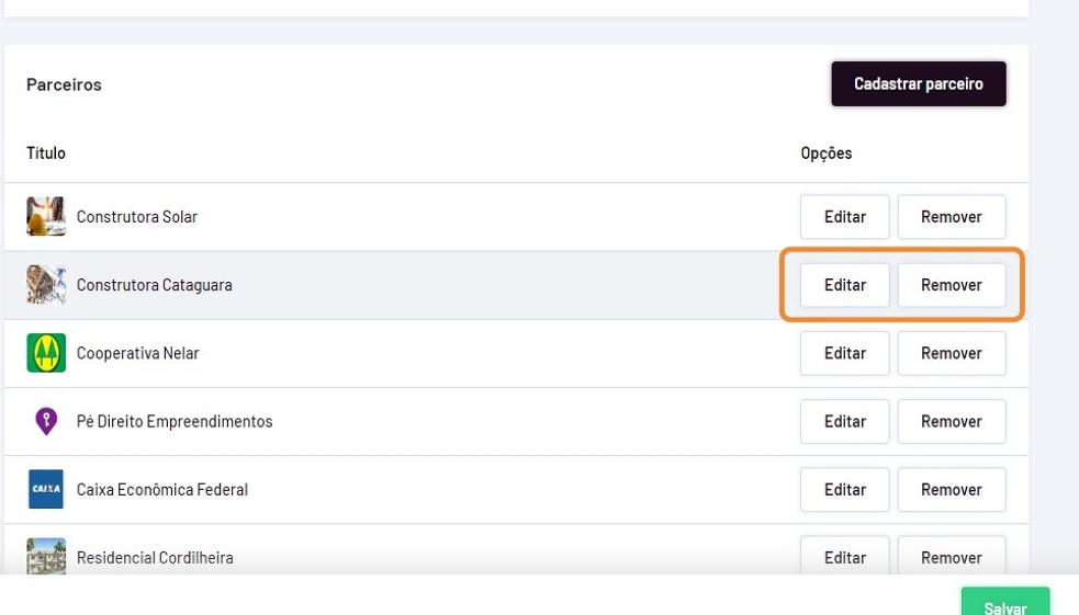 - Com o parceiro cadastrado, você poderá editar as informações ou remover.