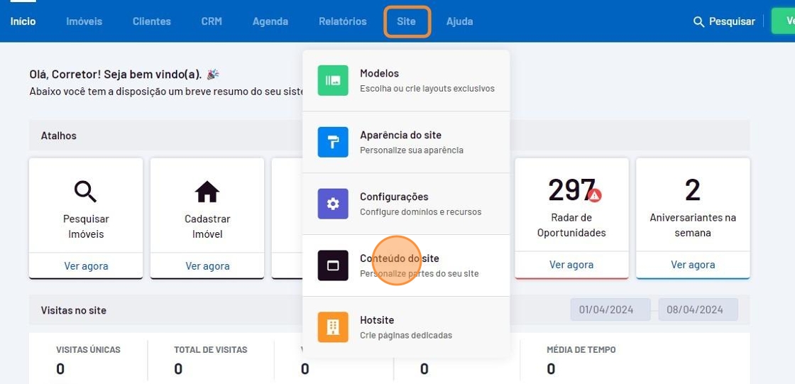 - Vá até o menu "Site" e clique em "Conteúdo do site".