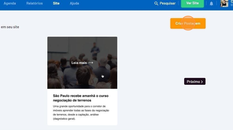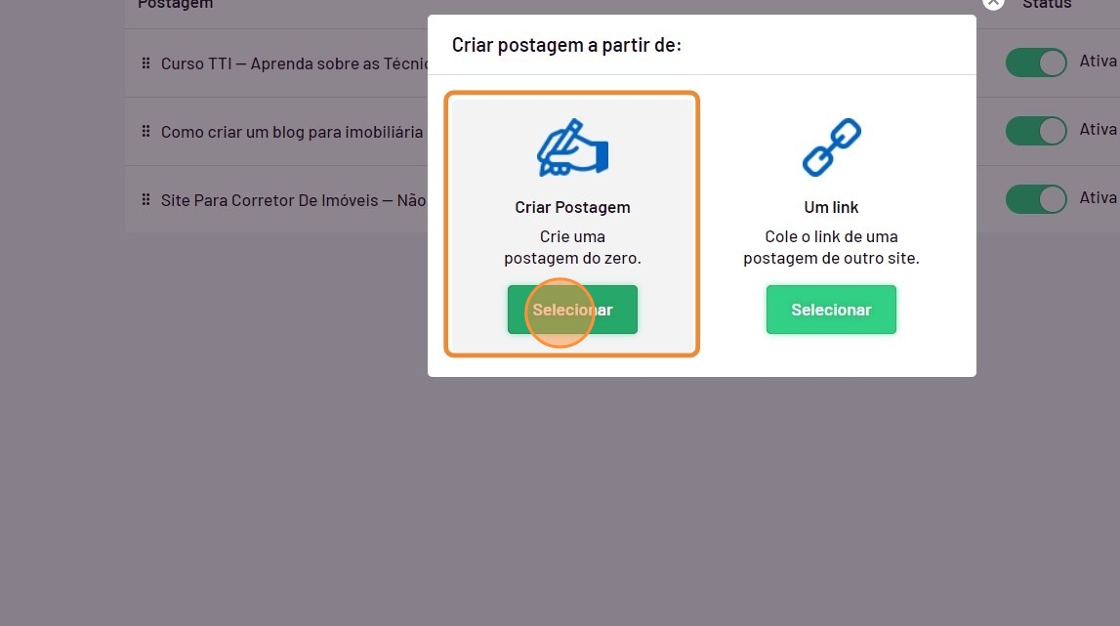 Neste primeiro momento criaremos uma postagem do zero. Clique então em "Selecionar" na opção "Criar Postagem".