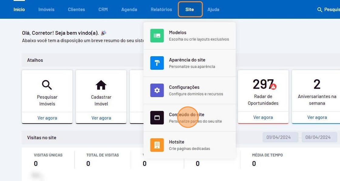 - Vá até o menu "Site" e clique em "Conteúdos do site".