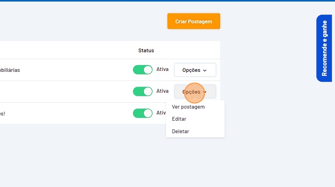 - Passando o mouse em "Opções" você consegue ver a postagem criada, editar ou deletar.