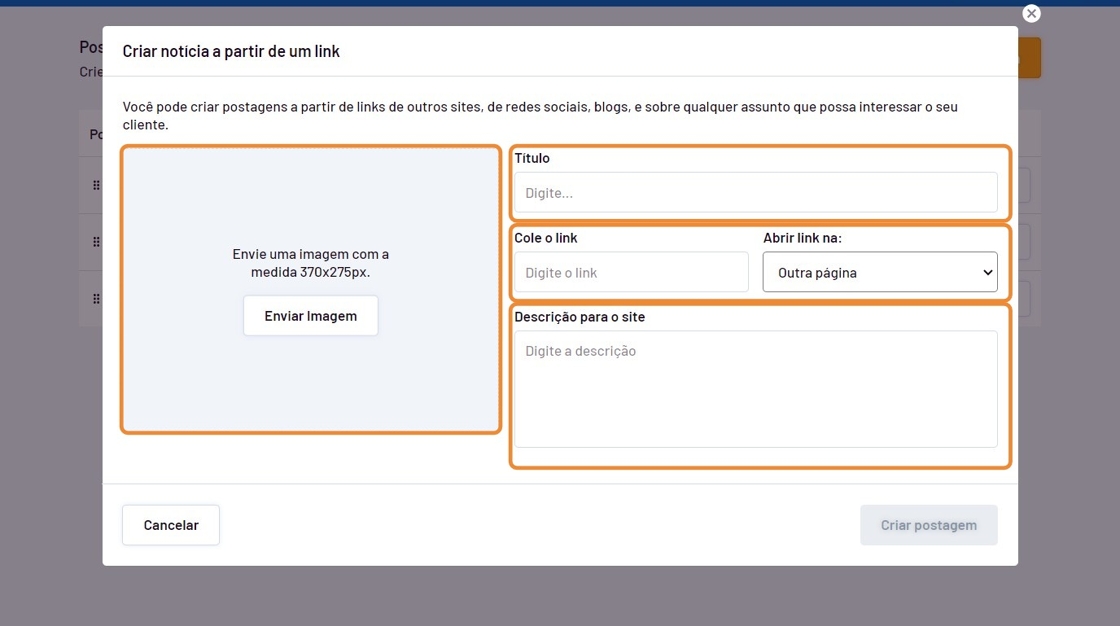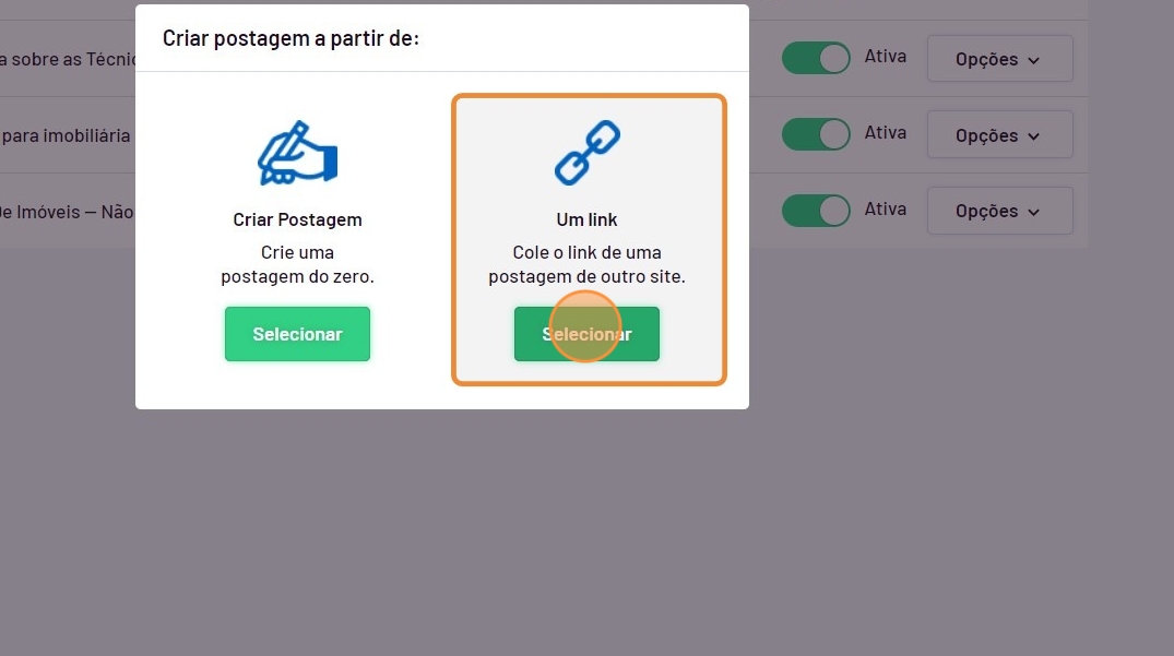 - Você pode criar uma postagem do zero, inserindo o texto, imagens e título que serão utilizados ou criar uma postagem através de um link de outro site/página.