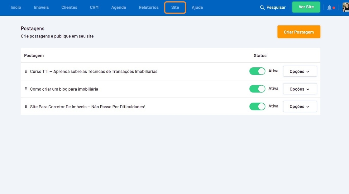 - A postagens criadas ficam disponibilizadas no menu "Postagens". Você pode chegar até este menu, passando o mouse sobre o menu "Site" e clicando em "Postagens".