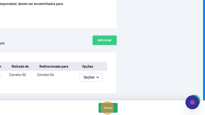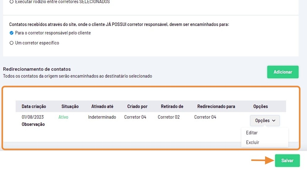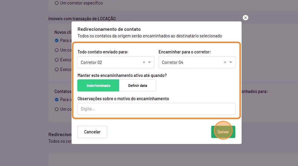- Selecione qual corretor terá os contatos redirecionados e qual corretor receberá esses contatos, defina o período que essa configuração ficará ativa e adicione observações sobre o motivo do encaminhamento, em seguida clique em "Salvar".