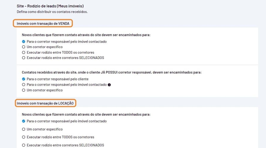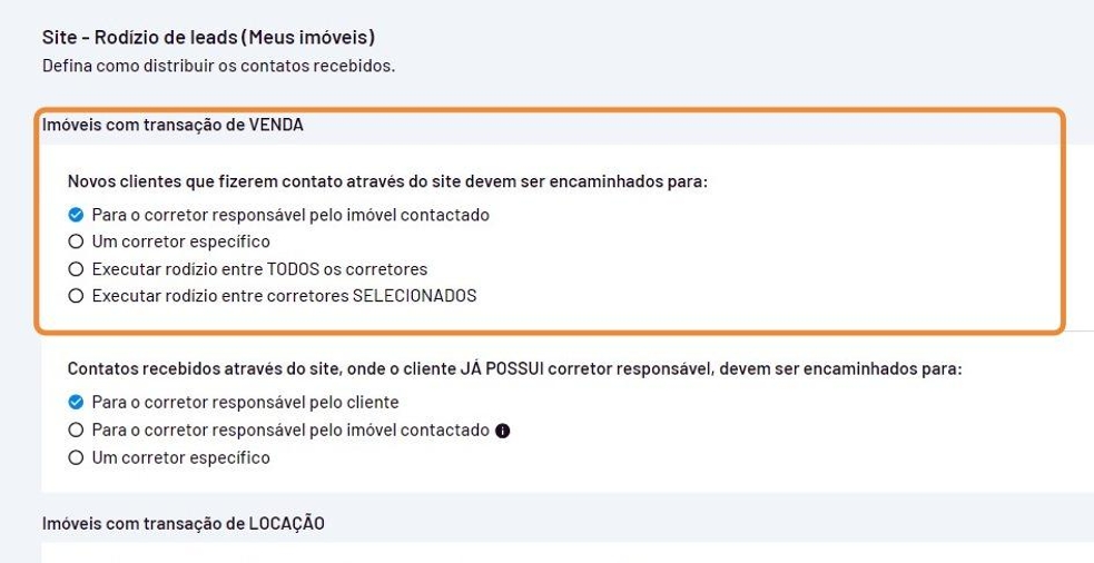 - Defina como será a distribuição dos contatos recebidos, para VENDA e para LOCAÇÃO.