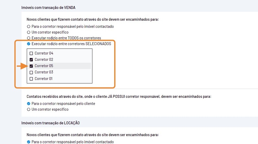- Na opção "Executar rodízio entre corretores SELECIONADOS", escolha quais corretores irão participar do rodízio. A ordem do rodízio será a mesma da lista de corretores selecionados, começando pelo primeiro.