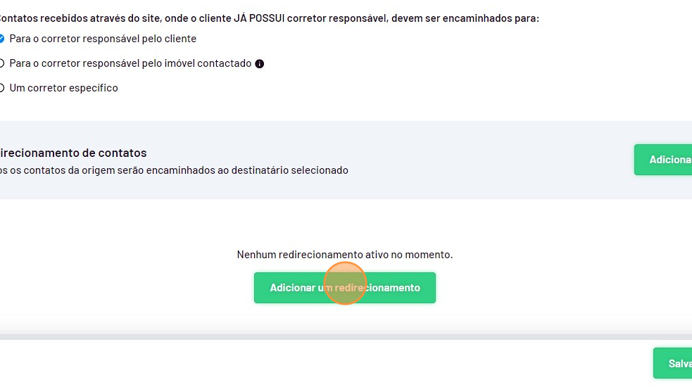 Atenção: Na opção "Um corretor específico", se o cliente já estiver atribuído a outro corretor, o último a receber um contato será designado como responsável. Portanto, para que essa opção funcione corretamente, é necessário que as permissões/privacidade permitam que os corretores possam visualizar os clientes uns dos outros.