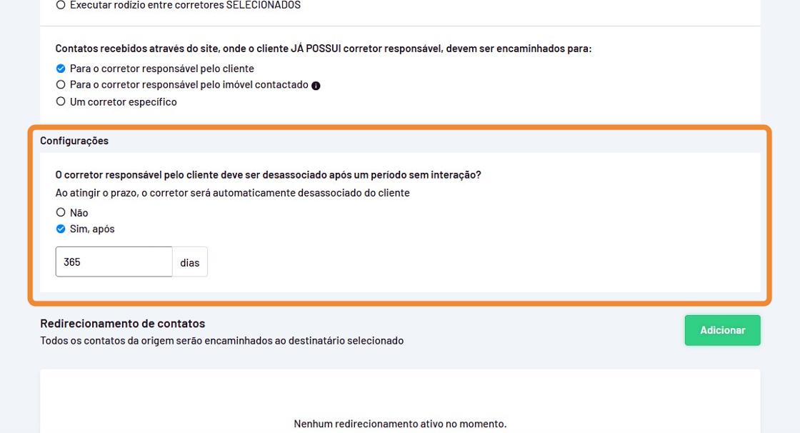 - Configure se deseja desassociar o cliente do corretor após um período sem interação.