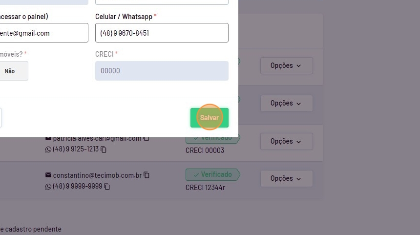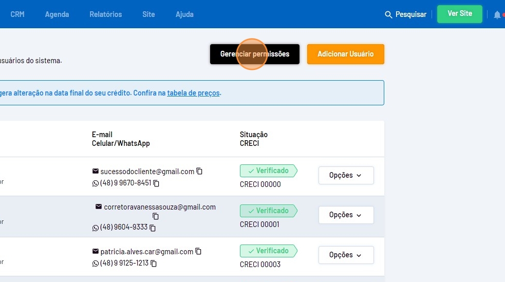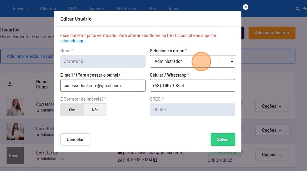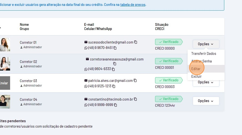 - Em "Corretores/Usuários" vá até o usuário desejado, passe o mouse em "Opções" e clique em "Editar".