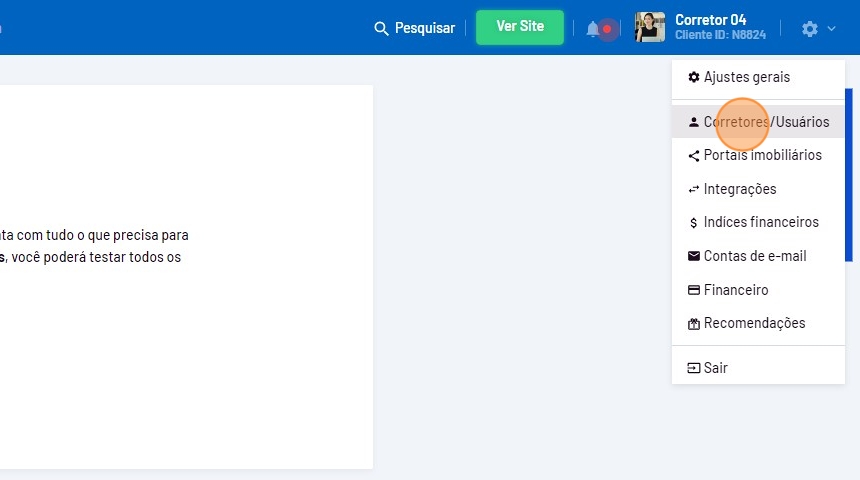 - Passe o mouse sobre a engrenagem no canto superior direito da sua tela e clique em "Corretores/Usuários".