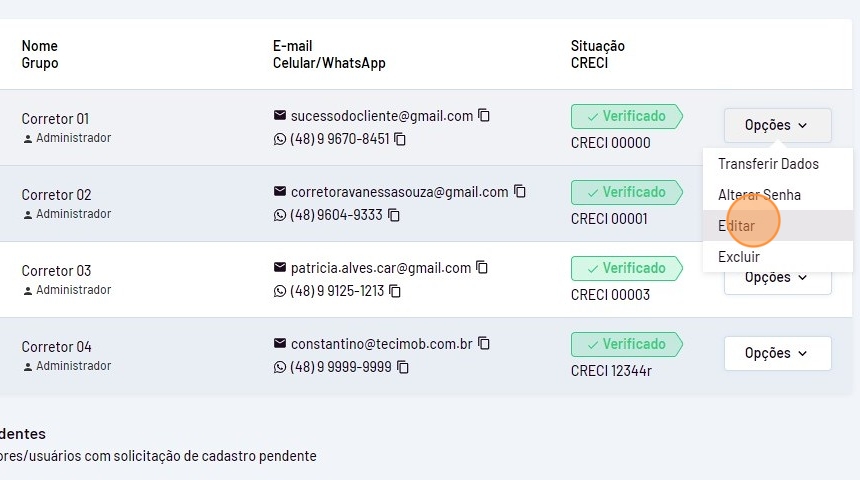 - Você pode editar o grupo, email de acesso e celular do contato.