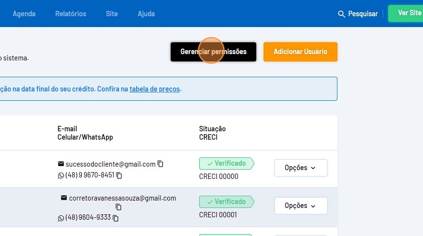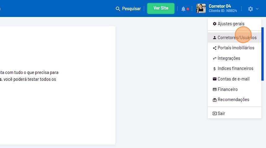 - Passe o mouse sobre a engrenagem no canto superior direito da sua tela e clique em "Corretores/Usuários".
