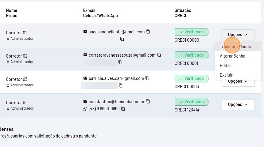 - Vá até o usuário, passe o mouse em "Opções" e clique em "Transferir Dados".