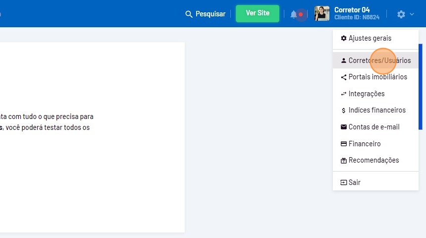 - Passe o mouse sobre a engrenagem no canto superior direito da sua tela e clique em "Corretores/Usuários".