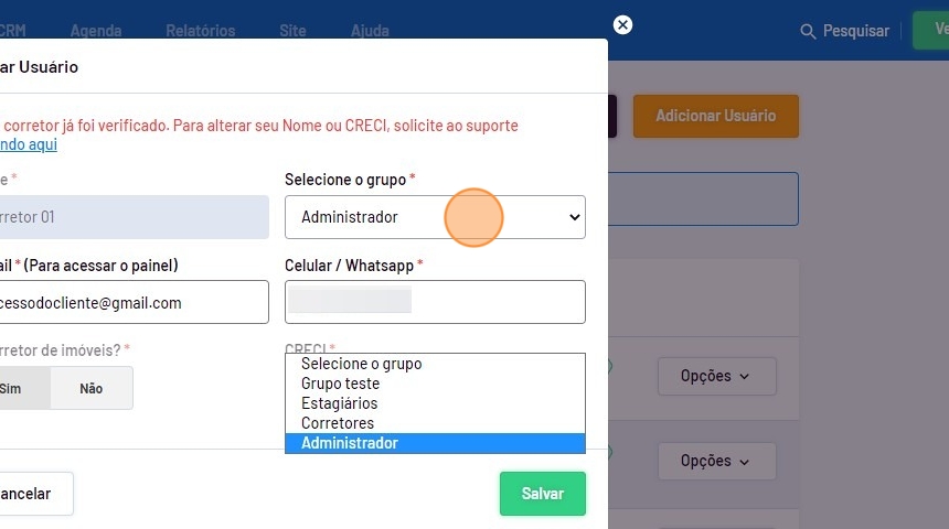 Para alterar grupo do usuário no sistema do Tecimob, siga esses passos: