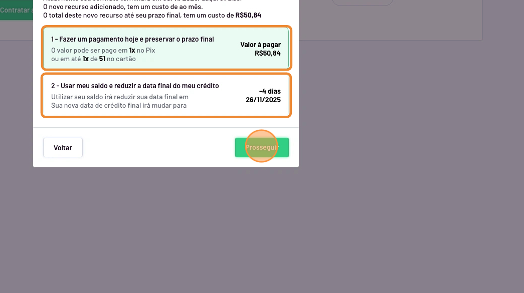 Nesta opção, você não precisará fazer um pagamento adicional pela integração. Em vez disso, o prazo final dos seus créditos será reduzido proporcionalmente. Abaixo serão exibidos todos os detalhes, incluindo os dias que serão deduzidos e a nova data de validade dos seus créditos.
