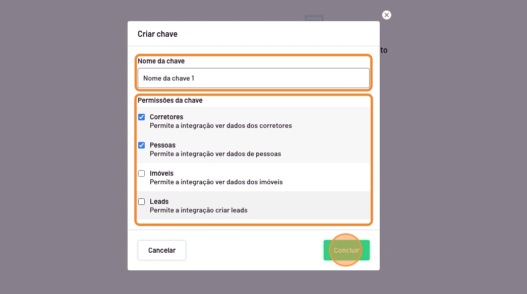 - Após realizar o pagamento, para criar a chave API, preencha o "Nome da chave" e selecione as "Permissões da chave".