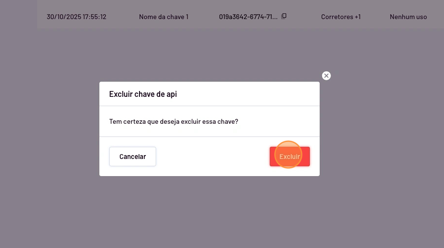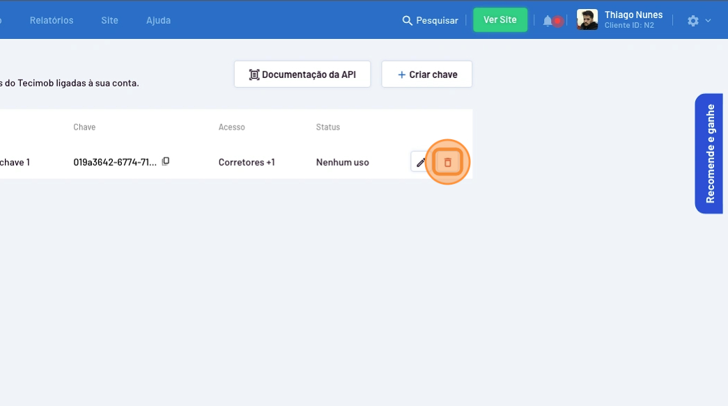 - Para excluir a integração via API, clique no ícone de lixeira: