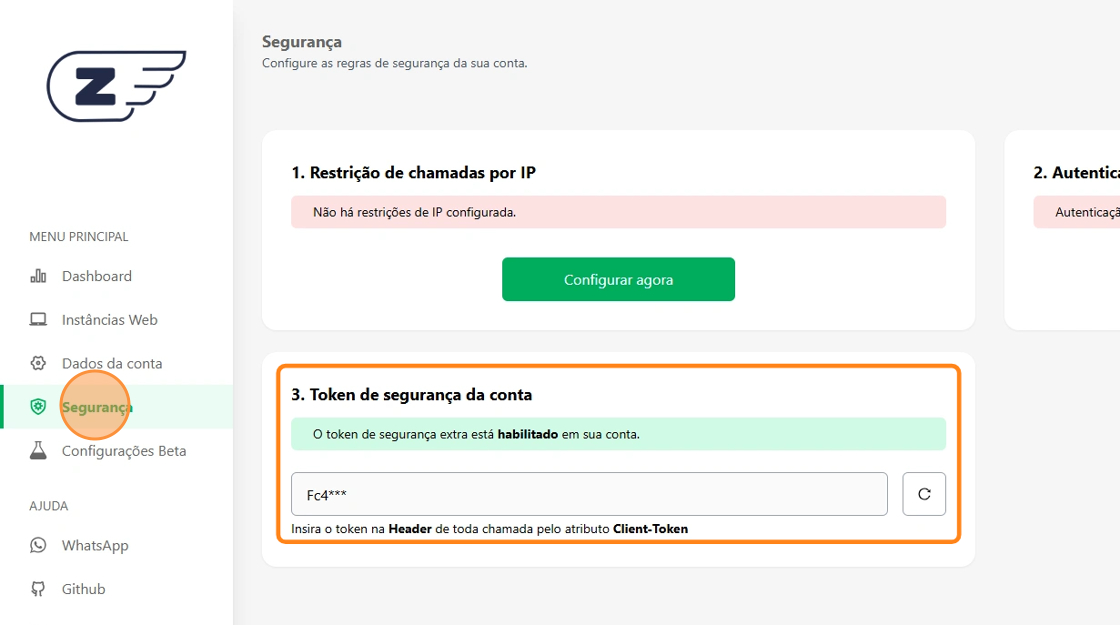 No menu lateral, na área "Segurança" é possível localizar o Token de segurança, desde que esteja ativo.