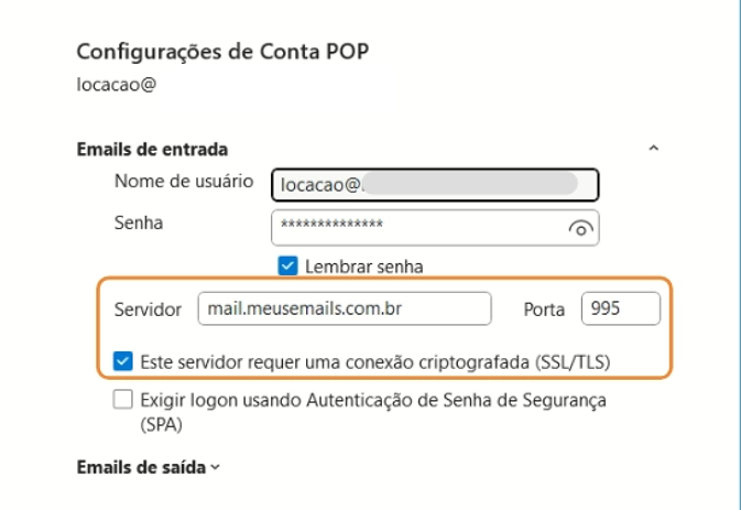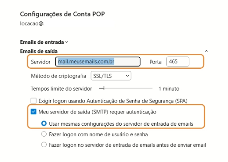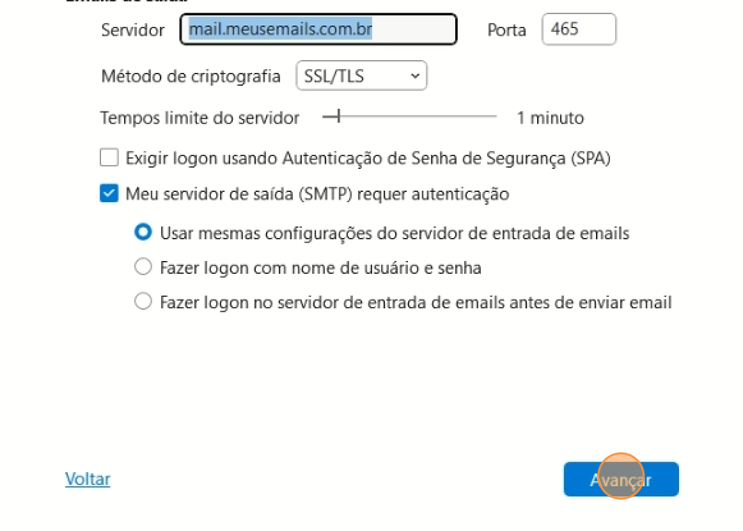 Selecione a opção: "Meu servidor de saída (SMTP) requer autenticação" e "Usar mesmas configurações do servidor de entrada de emails"